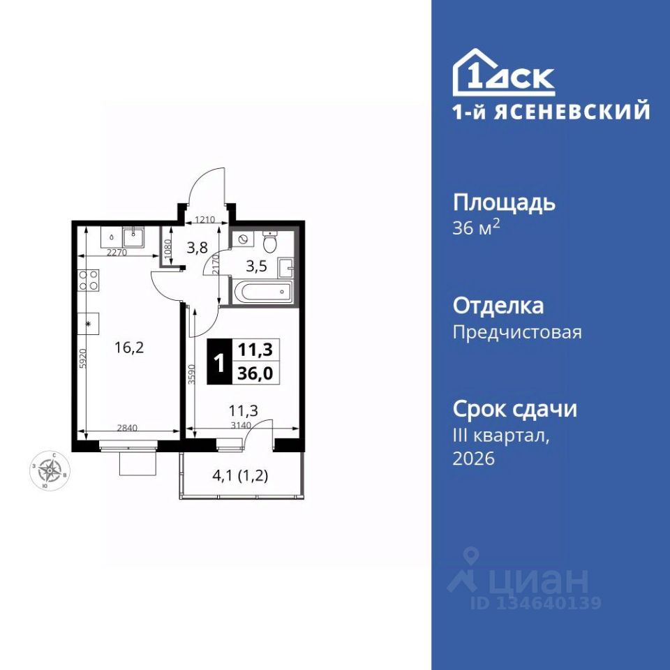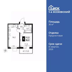 Продаётся 1-к квартира номер 376 общей площадью 36 кв.м. на 9-м этаже 9 этажного здания. Отделка Whitebox.