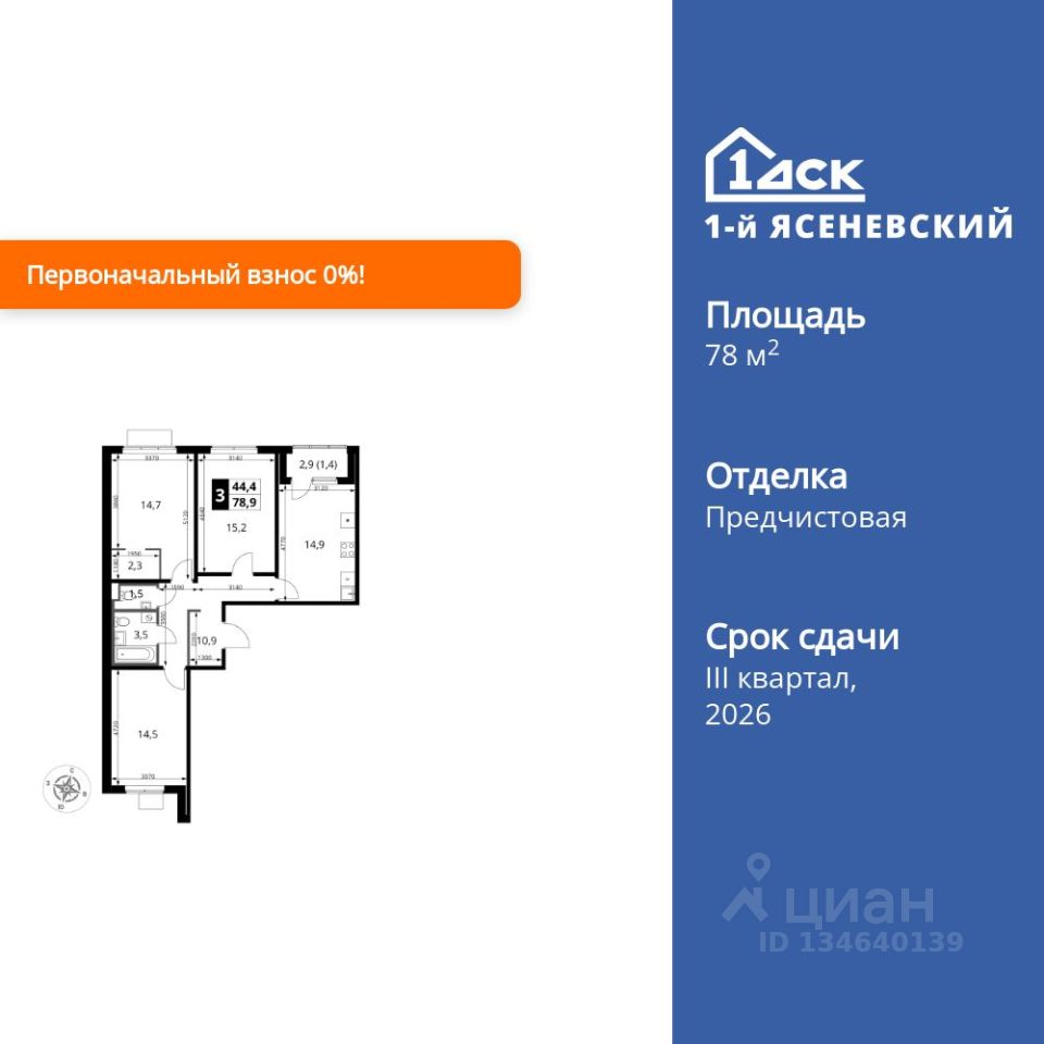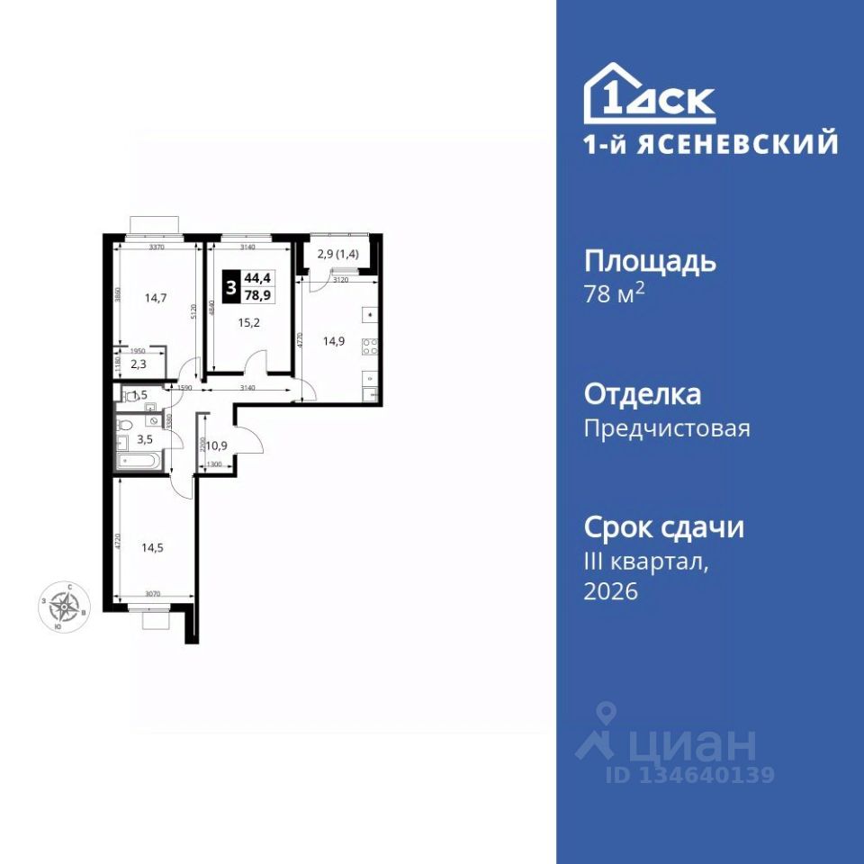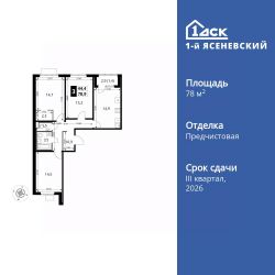 Продаётся 3-к квартира номер 377 общей площадью 78.9 кв.м. на 9-м этаже 9 этажного здания. Отделка Whitebox. Цена с учётом скидки.