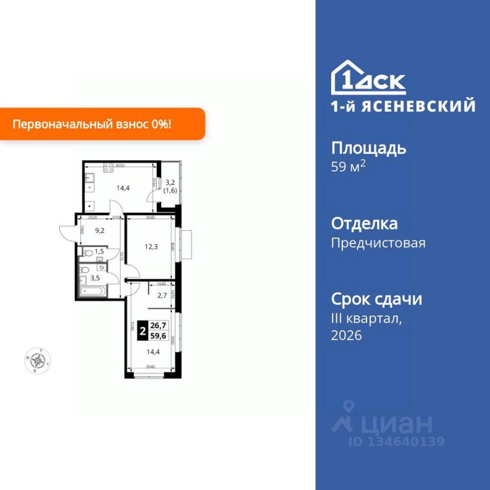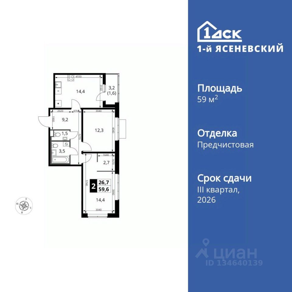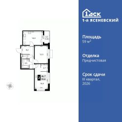Продаётся 2-к квартира номер 485 общей площадью 59.6 кв.м. на 8-м этаже 18 этажного здания. Отделка Whitebox. Цена с учётом скидки.