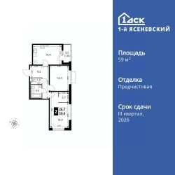 Продаётся 2-к квартира номер 518 общей площадью 59.6 кв.м. на 11-м этаже 18 этажного здания. Отделка Whitebox. Цена с учётом скидки.