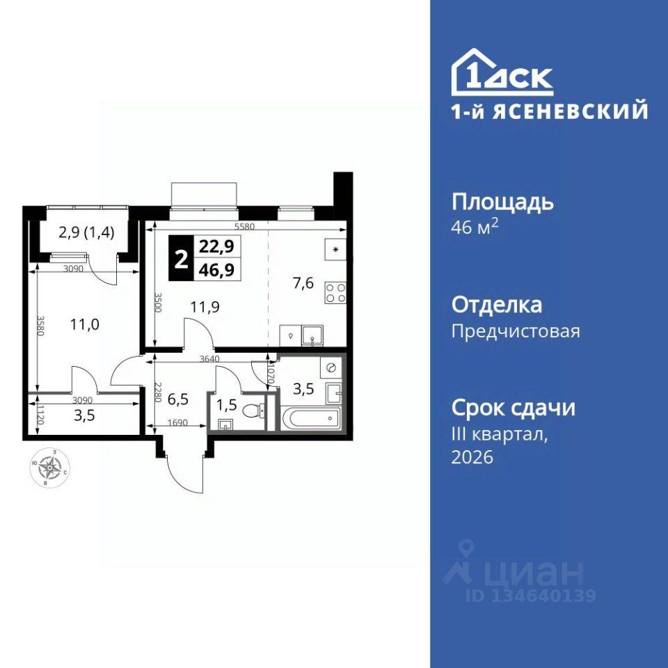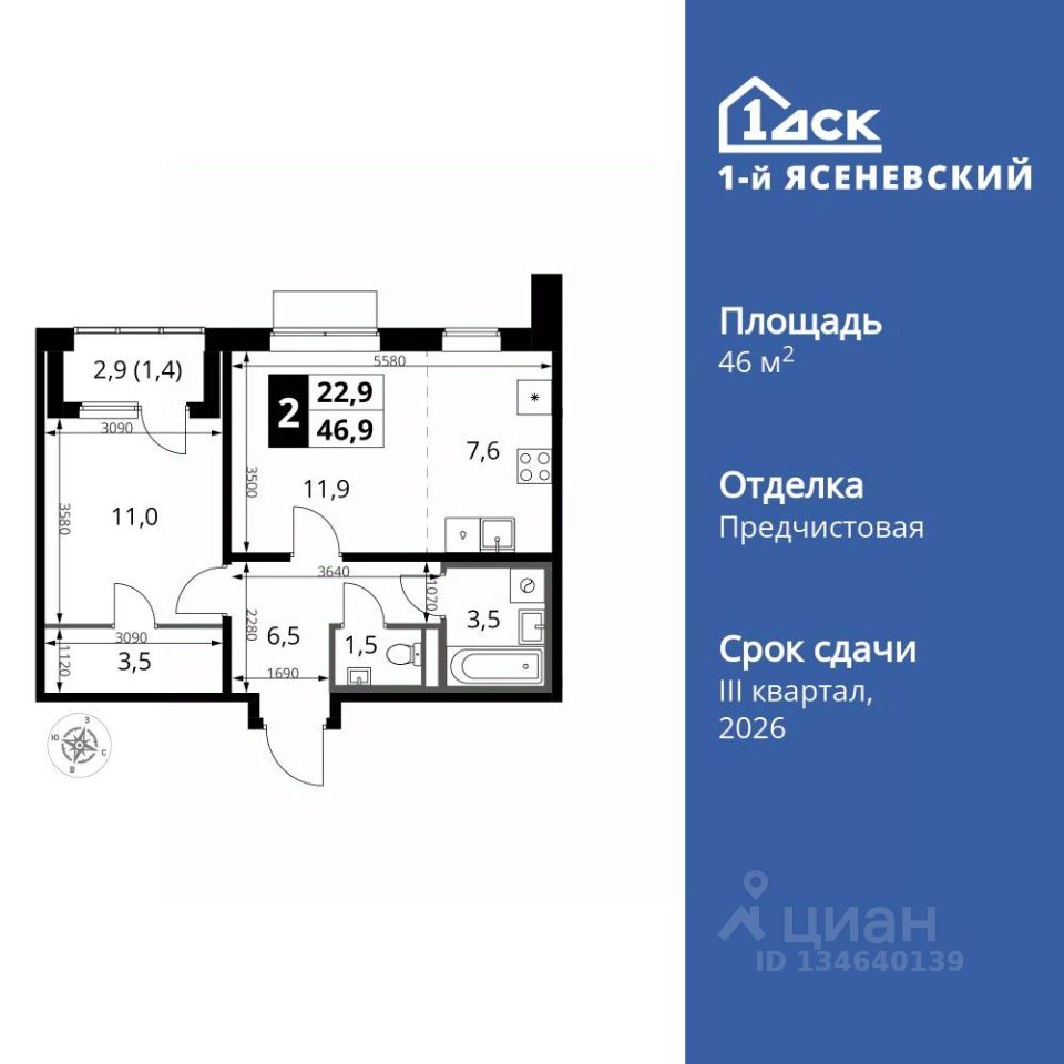 Продаётся 2-к квартира номер 538 общей площадью 46.9 кв.м. на 12-м этаже 18 этажного здания. Отделка Whitebox. Цена с учётом скидки.