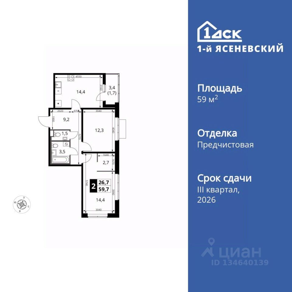 Продаётся 2-к квартира номер 562 общей площадью 59.7 кв.м. на 15-м этаже 18 этажного здания. Отделка Whitebox. Цена с учётом скидки.