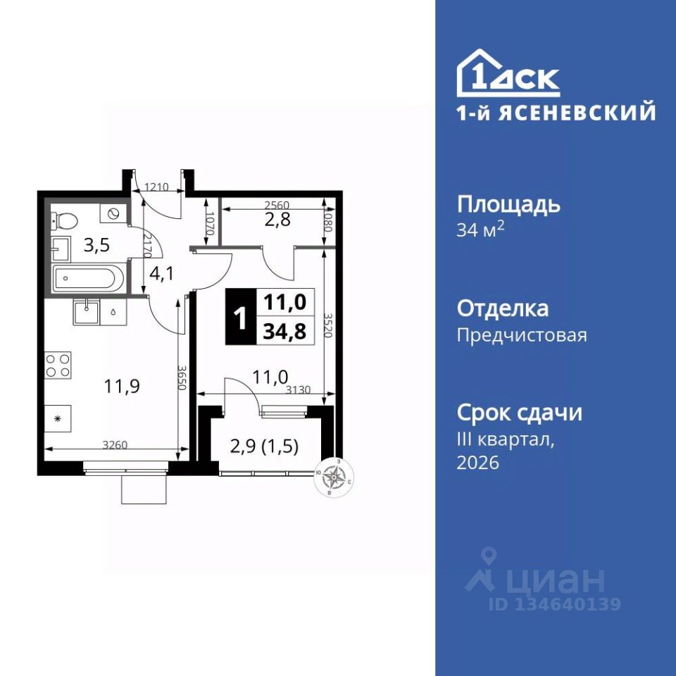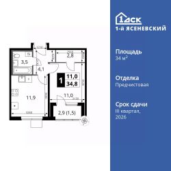 Продаётся 1-к квартира номер 597 общей площадью 34.8 кв.м. на 18-м этаже 18 этажного здания. Отделка Whitebox.