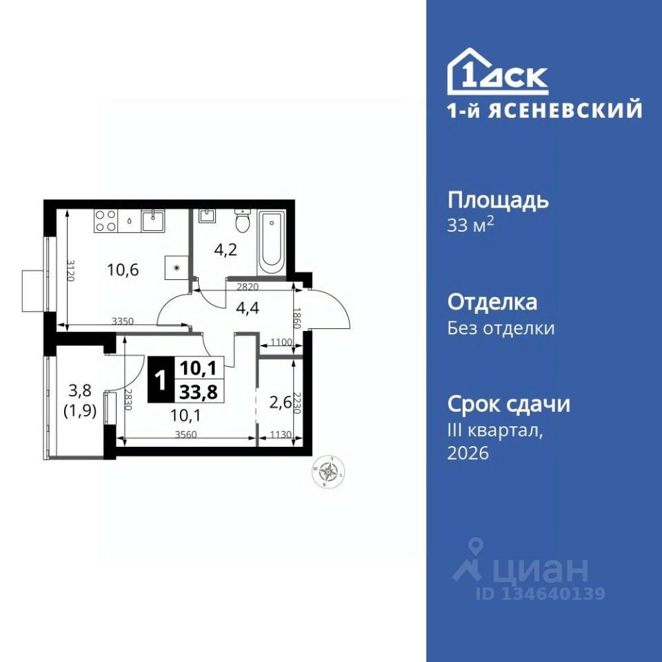 Продаётся 1-к квартира номер 100 общей площадью 33.8 кв.м. на 16-м этаже 16 этажного здания. Без отделки.