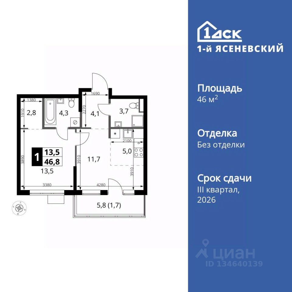 Продаётся 1-к квартира номер 1045 общей площадью 46.8 кв.м. на 2-м этаже 6 этажного здания. Без отделки.