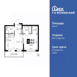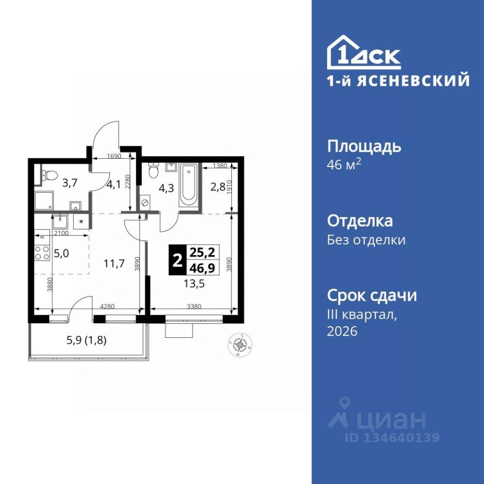 Продаётся 2-к квартира номер 1060 общей площадью 46.9 кв.м. на 6-м этаже 6 этажного здания. Без отделки.