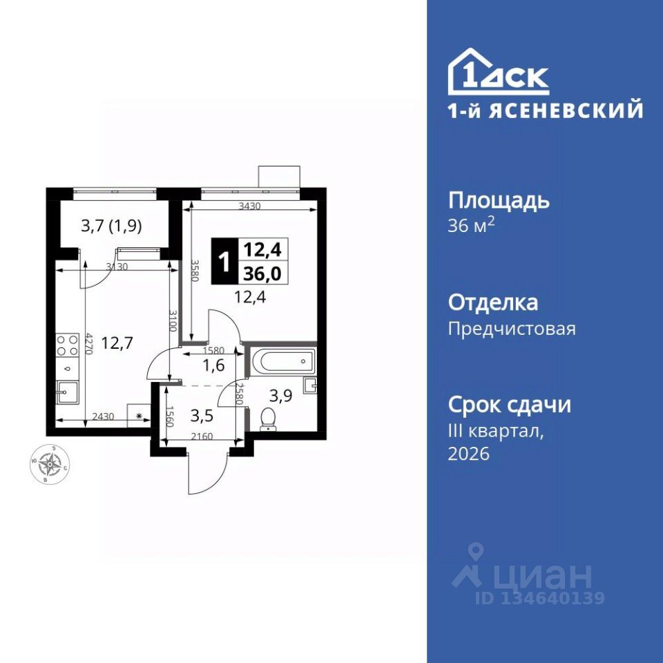 Продаётся 1-к квартира номер 244 общей площадью 36 кв.м. на 13-м этаже 16 этажного здания. Отделка Whitebox.