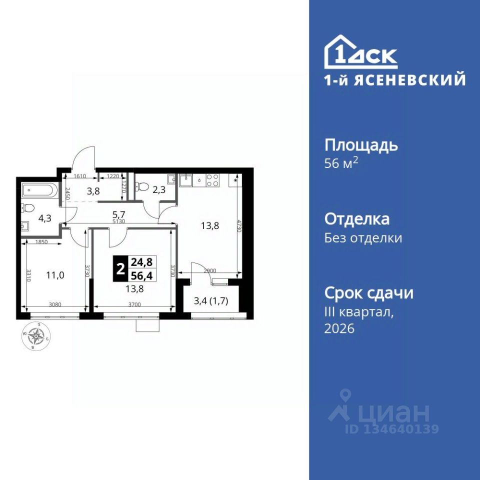 Продаётся 2-к квартира номер 284 общей площадью 56.4 кв.м. на 16-м этаже 16 этажного здания. Без отделки.