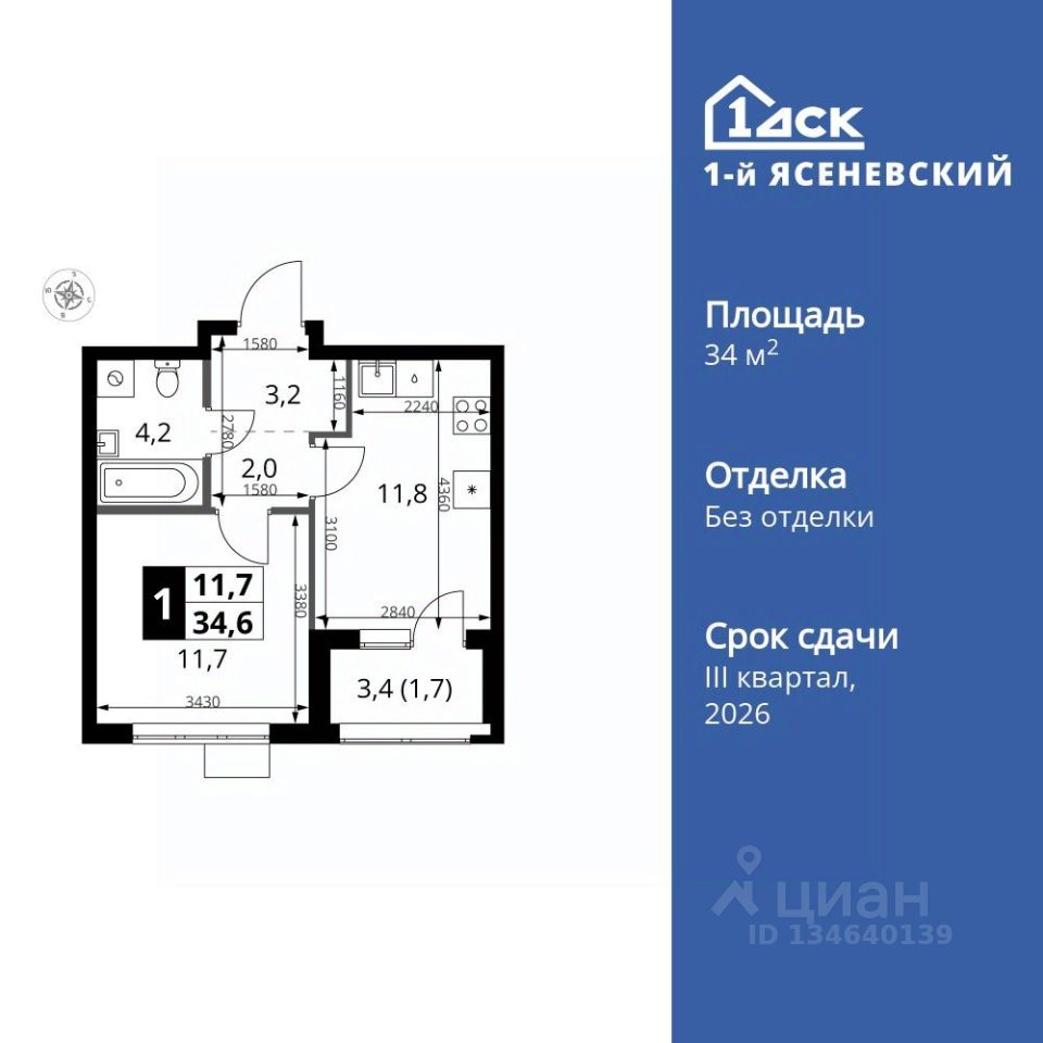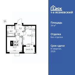 Продаётся 1-к квартира номер 407 общей площадью 34.6 кв.м. на 13-м этаже 18 этажного здания. Без отделки.