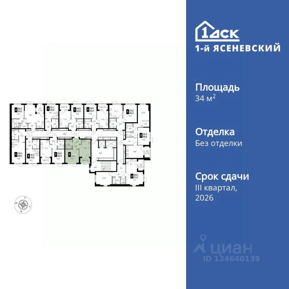 Продаётся 1-к квартира номер 440 общей площадью 34.6 кв.м. на 16-м этаже 18 этажного здания. Без отделки.