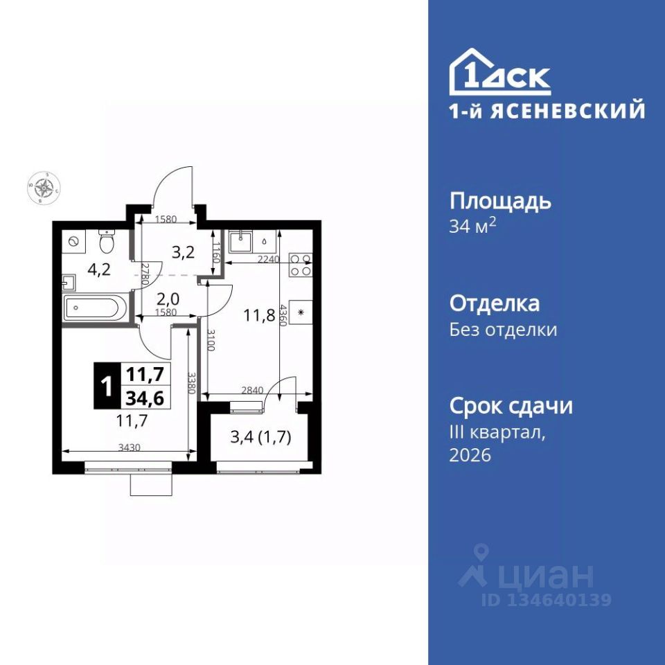 Продаётся 1-к квартира номер 341 общей площадью 34.6 кв.м. на 7-м этаже 18 этажного здания. Без отделки.