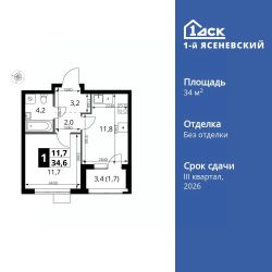 Продаётся 1-к квартира номер 363 общей площадью 34.6 кв.м. на 9-м этаже 18 этажного здания. Без отделки.