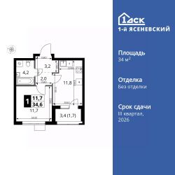 Продаётся 1-к квартира номер 385 общей площадью 34.6 кв.м. на 11-м этаже 18 этажного здания. Без отделки.