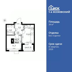 Продаётся 1-к квартира номер 462 общей площадью 34.6 кв.м. на 18-м этаже 18 этажного здания. Без отделки.