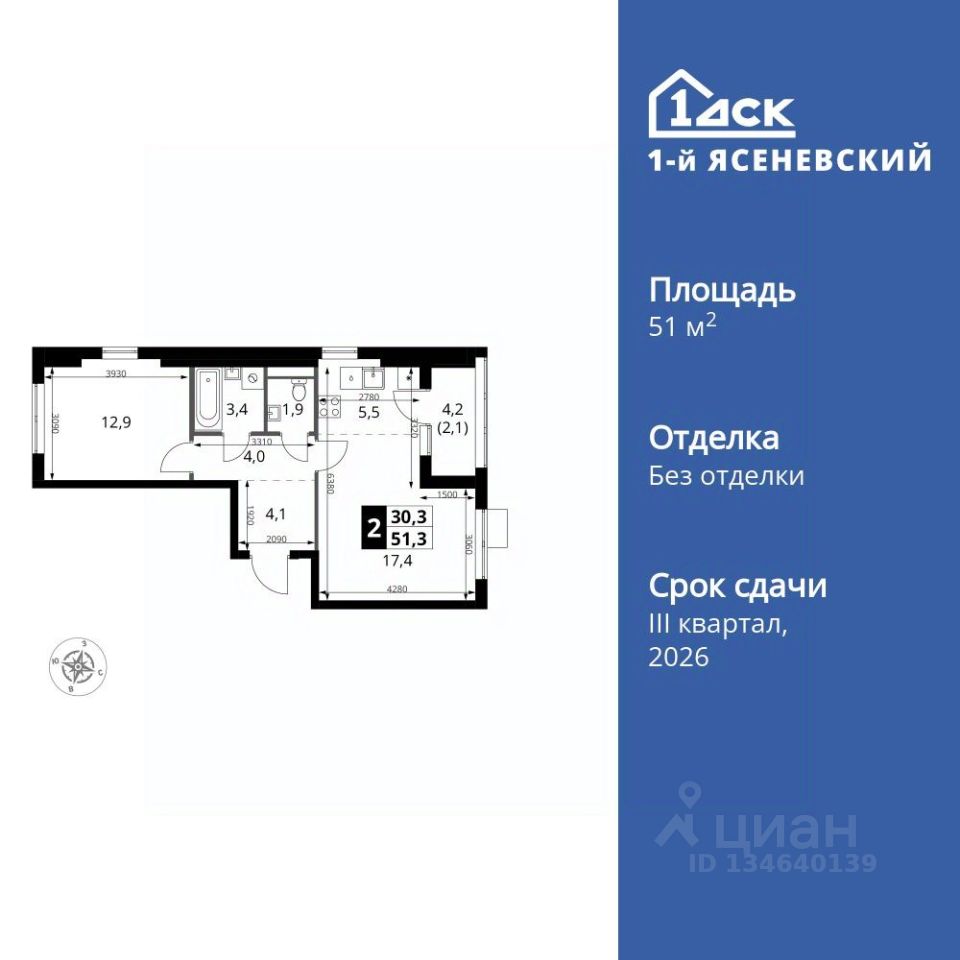 Продаётся 2-к квартира номер 720 общей площадью 51.3 кв.м. на 17-м этаже 18 этажного дома. Без отделки.