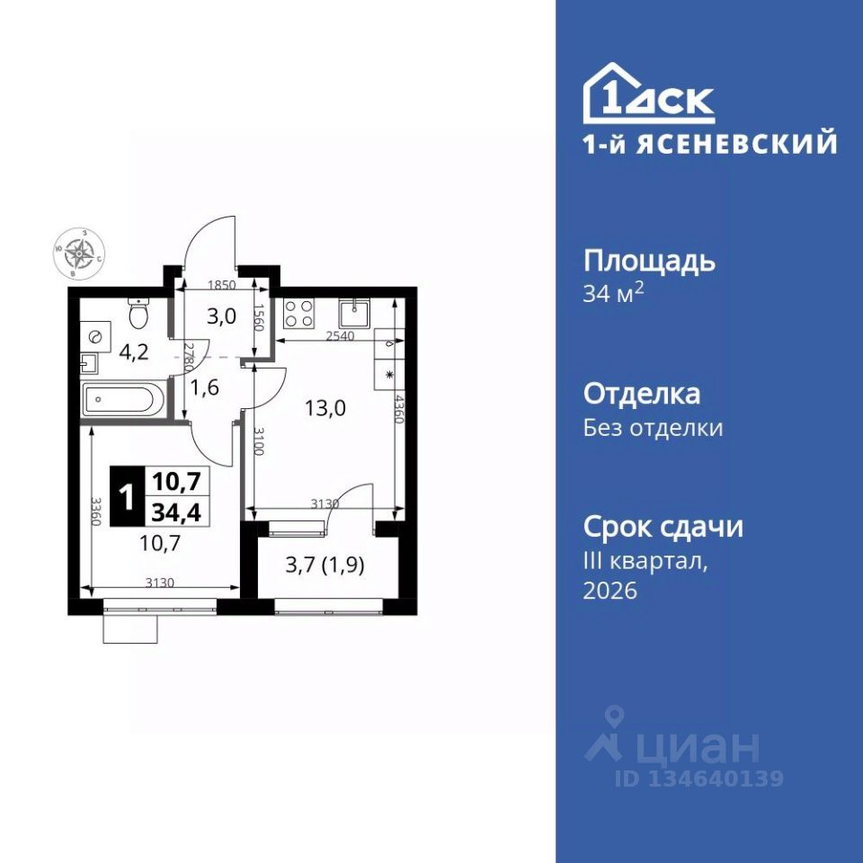 Продаётся 1-к квартира номер 642 общей площадью 34.4 кв.м. на 8-м этаже 18 этажного здания. Без отделки.