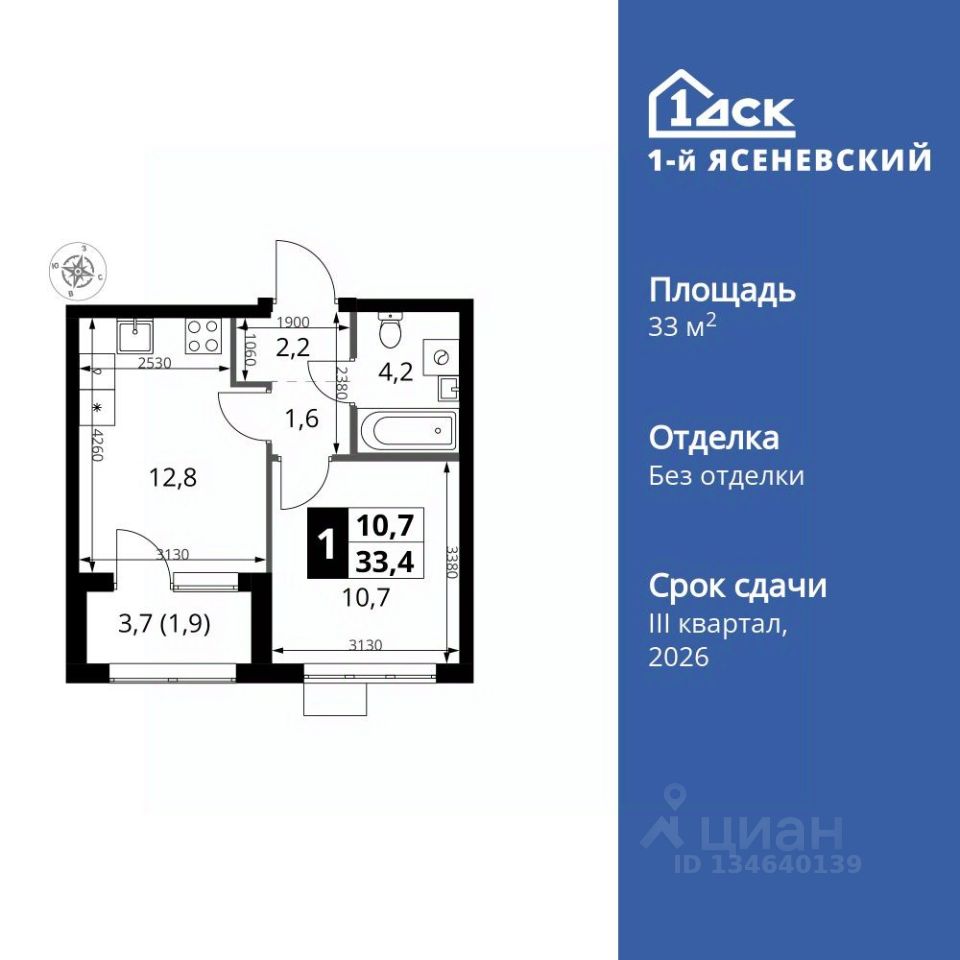 Продаётся 1-к квартира номер 733 общей площадью 33.4 кв.м. на 18-м этаже 18 этажного здания. Без отделки.