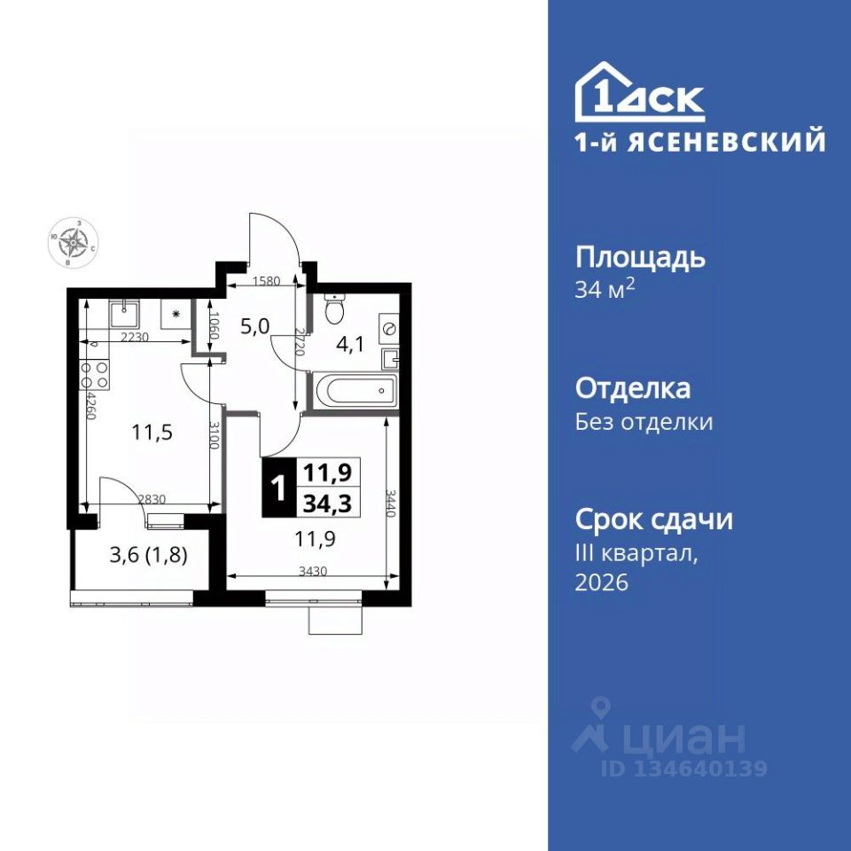 Продаётся 1-к квартира номер 1017 общей площадью 34.3 кв.м. на 16-м этаже 18 этажного здания. Без отделки.