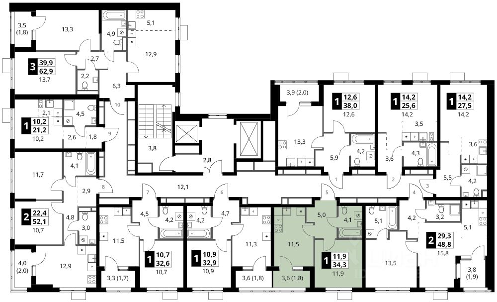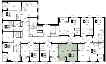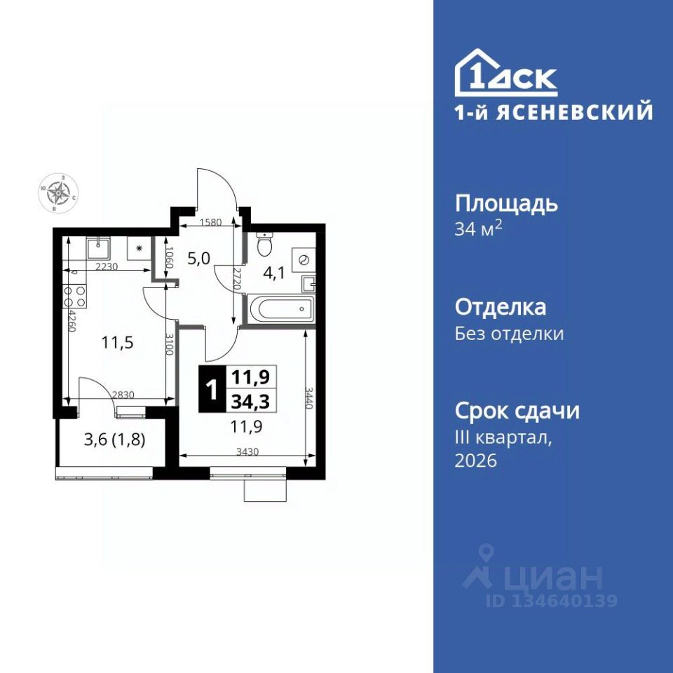 Продаётся 1-к квартира номер 897 общей площадью 34.3 кв.м. на 4-м этаже 18 этажного здания. Без отделки.