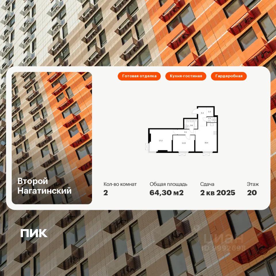 Продаётся 2-комн. квартира площадью 64,3 кв.м на 20 этаже 33 этажного дома (Корпус 1.1, Секция 1) проекта ПИК Второй Нагатинский. Светлый просторный подъезд на уровне земли, функциональная планировка, большие окна, c отделкой.