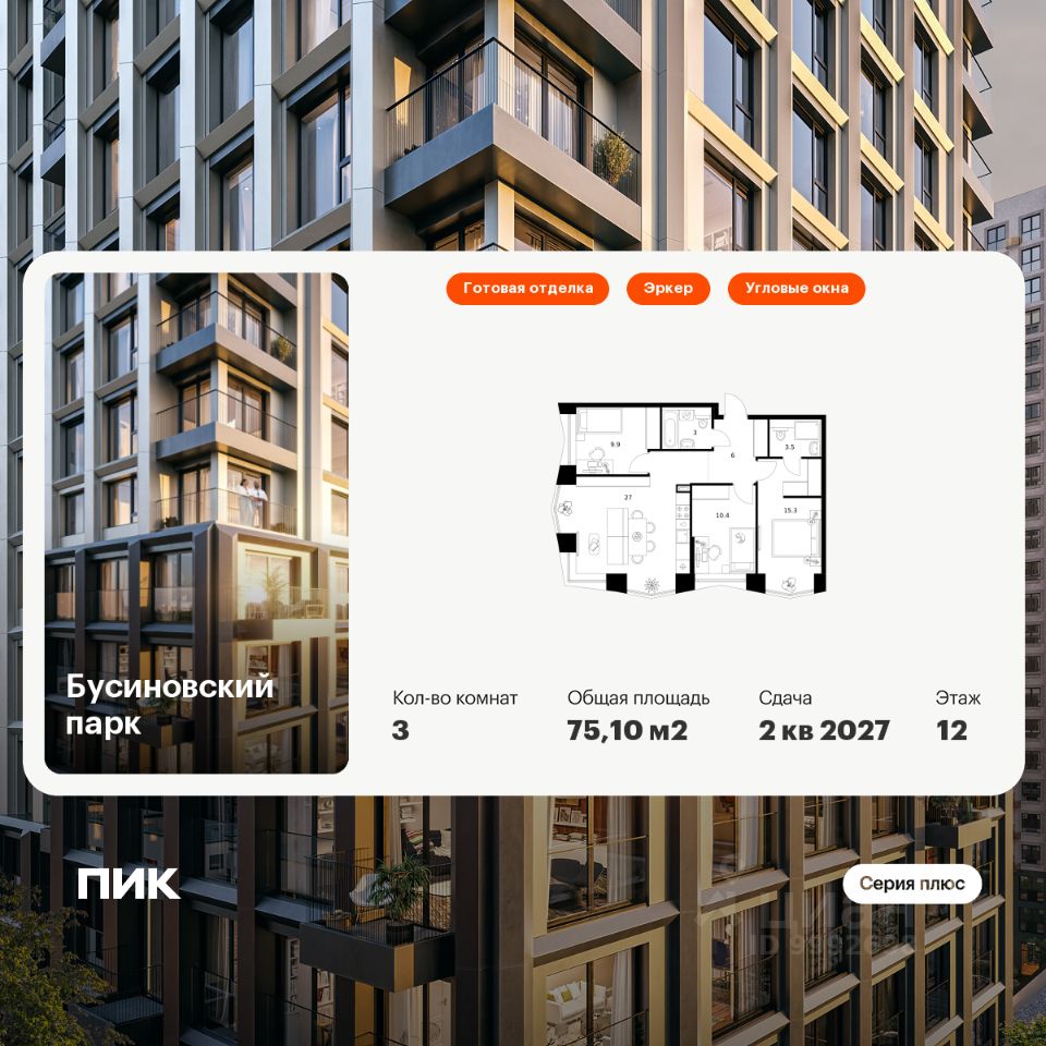 Продаётся 3-комн. квартира площадью 75,1 кв.м на 12 этаже 32 этажного дома (Корпус 2.3, Секция 1) проекта ПИК Бусиновский парк. Светлый просторный подъезд на уровне земли, функциональная планировка, большие окна, c отделкой.