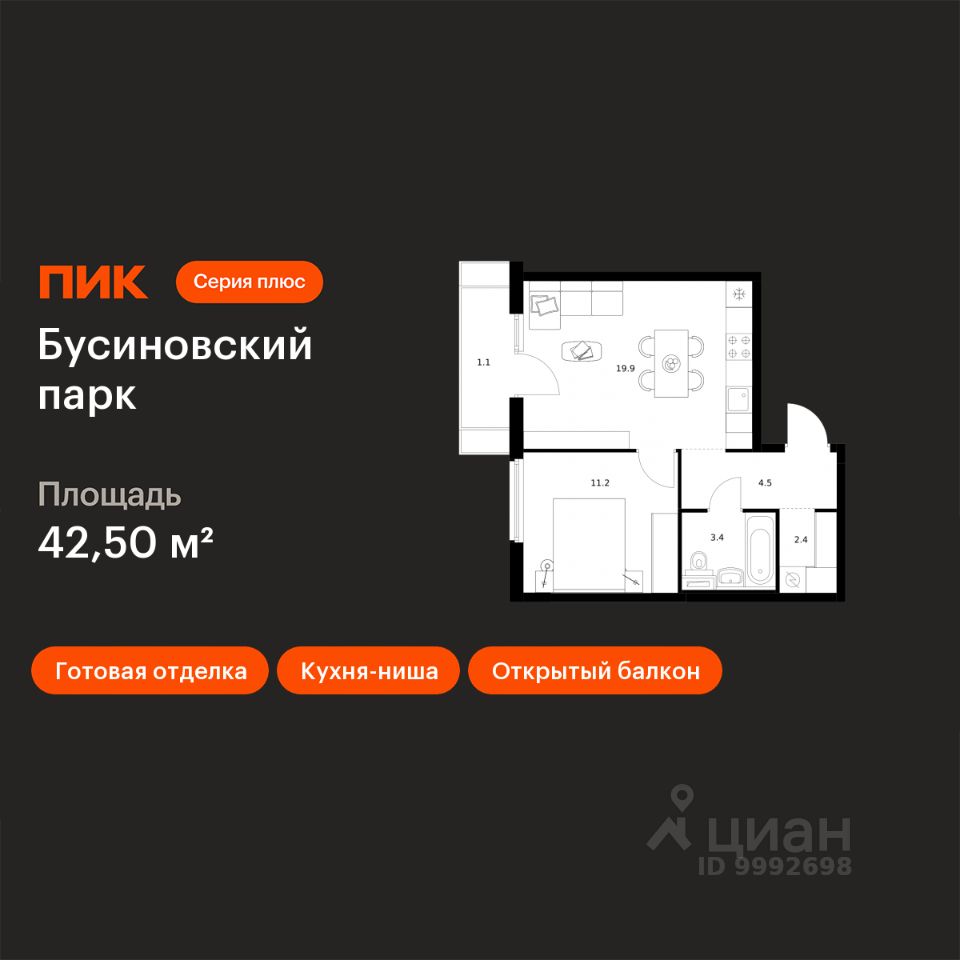 Продаётся 1-комн. квартира площадью 42,5 кв.м на 21 этаже 24 этажного дома (Корпус 22.2, Секция 2) проекта ПИК Бусиновский парк. Светлый просторный подъезд на уровне земли, функциональная планировка, большие окна, c отделкой.