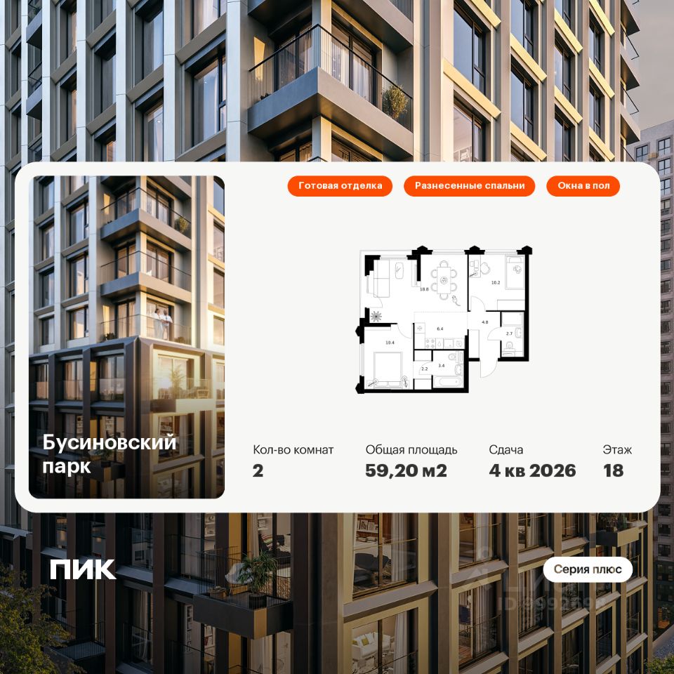 Продаётся 2-комн. квартира площадью 59,2 кв.м на 18 этаже 32 этажного дома (Корпус 22.1, Секция 1) проекта ПИК Бусиновский парк. Светлый просторный подъезд на уровне земли, функциональная планировка, большие окна, c отделкой.