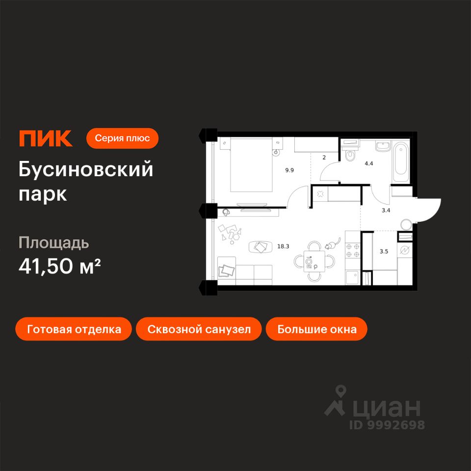 В "Бусиновском парке" предусмотрены квартиры с панорамным остеклением, различными балконами, эркерами, угловыми окнами и большим количеством окон — до пяти в одной комнате. В таких квартирах широкий угол обзора: можно пить кофе, наблюдая за жизнью на улице и наслаждаясь ощущением простора. Ещё больше комфорта придаст мягкий солнечный свет, который равномерно осветит всю квартиру. Артикул 95