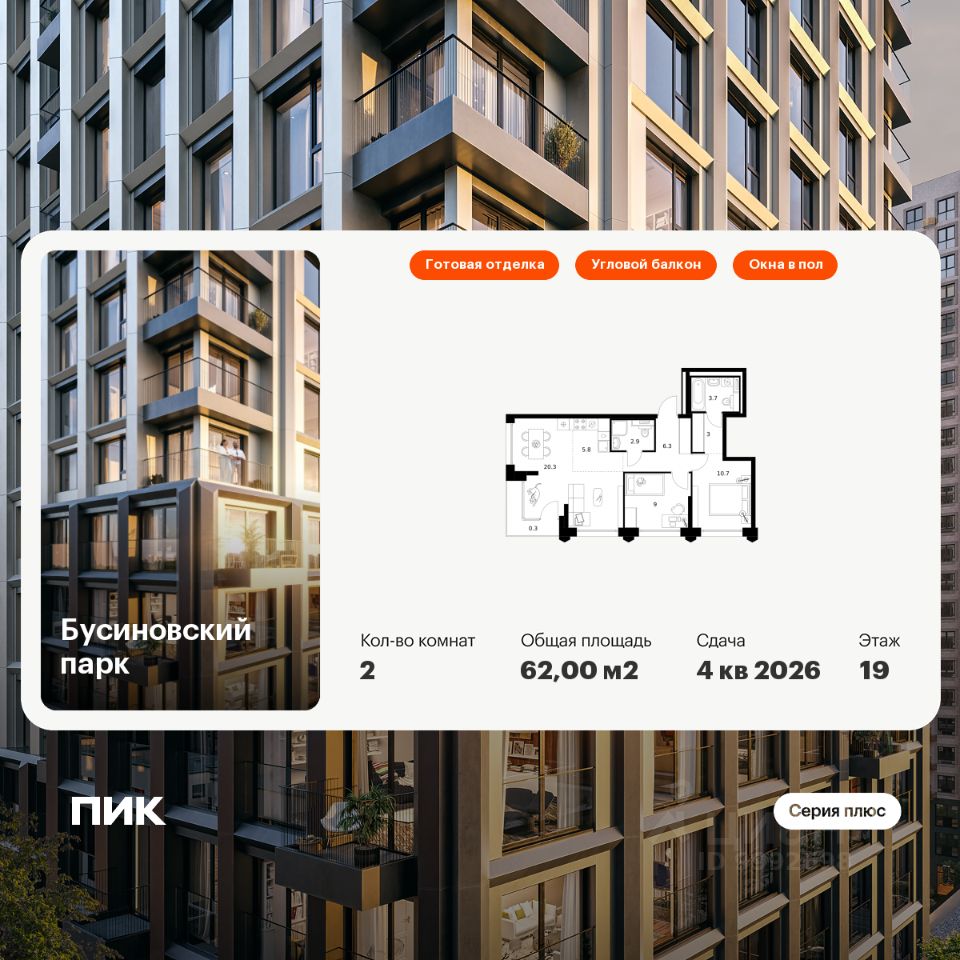 Продаётся 2-комн. квартира площадью 62 кв.м на 19 этаже 32 этажного дома (Корпус 22.3, Секция 3) проекта ПИК Бусиновский парк. Светлый просторный подъезд на уровне земли, функциональная планировка, большие окна, c отделкой.