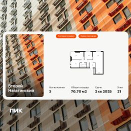 Продаётся 3-комн. квартира площадью 70,7 кв.м на 21 этаже 33 этажного дома (Корпус 1.3, Секция 3) проекта ПИК Второй Нагатинский. Светлый просторный подъезд на уровне земли, функциональная планировка, большие окна, c отделкой.