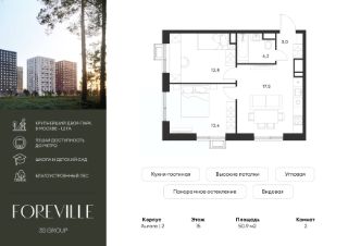 Продается уютная 2-комн. квартира площадью 50,9 кв.м на 15 этаже 17 этажного жилого комплекса бизнес-класса Foreville от 3S Group.