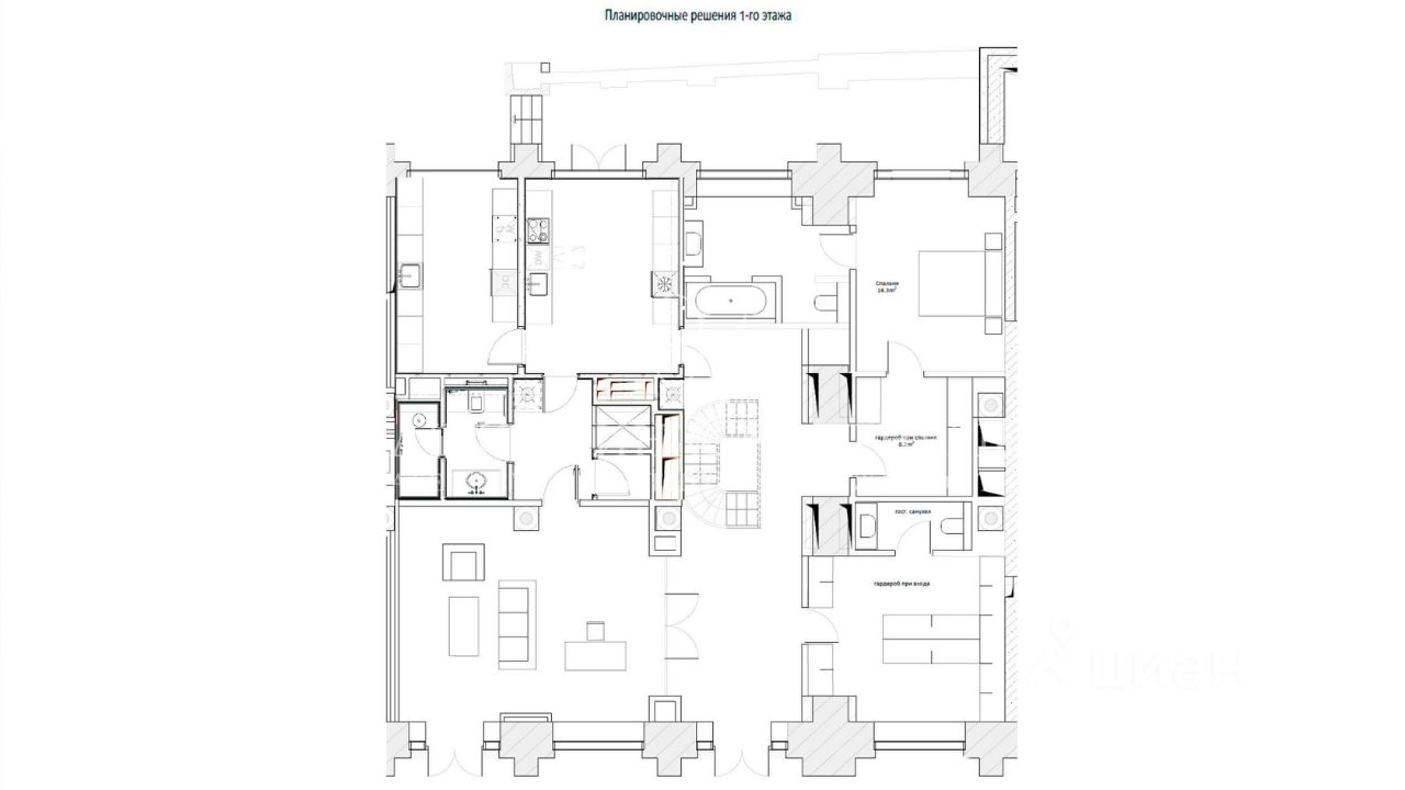 На первом этаже спланированы: парадная прихожая с большой гардеробной и санузлом, кабинет-библиотека, гостевая спальня с ванной комнатой и гардеробной. Для персонала выделен блок с технической кухней, постирочной и отдельным входом.