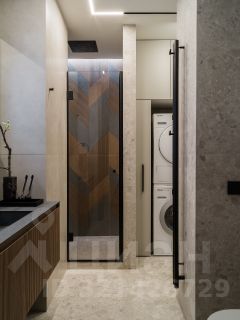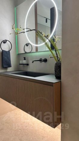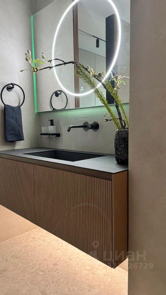 Сантехника: смесители GRB (Испания), интегрированная раковинаиз керамогранита, тумба с подсветкой из натурального шпона Brenta, аксессуары Hans Grohe (Германия);