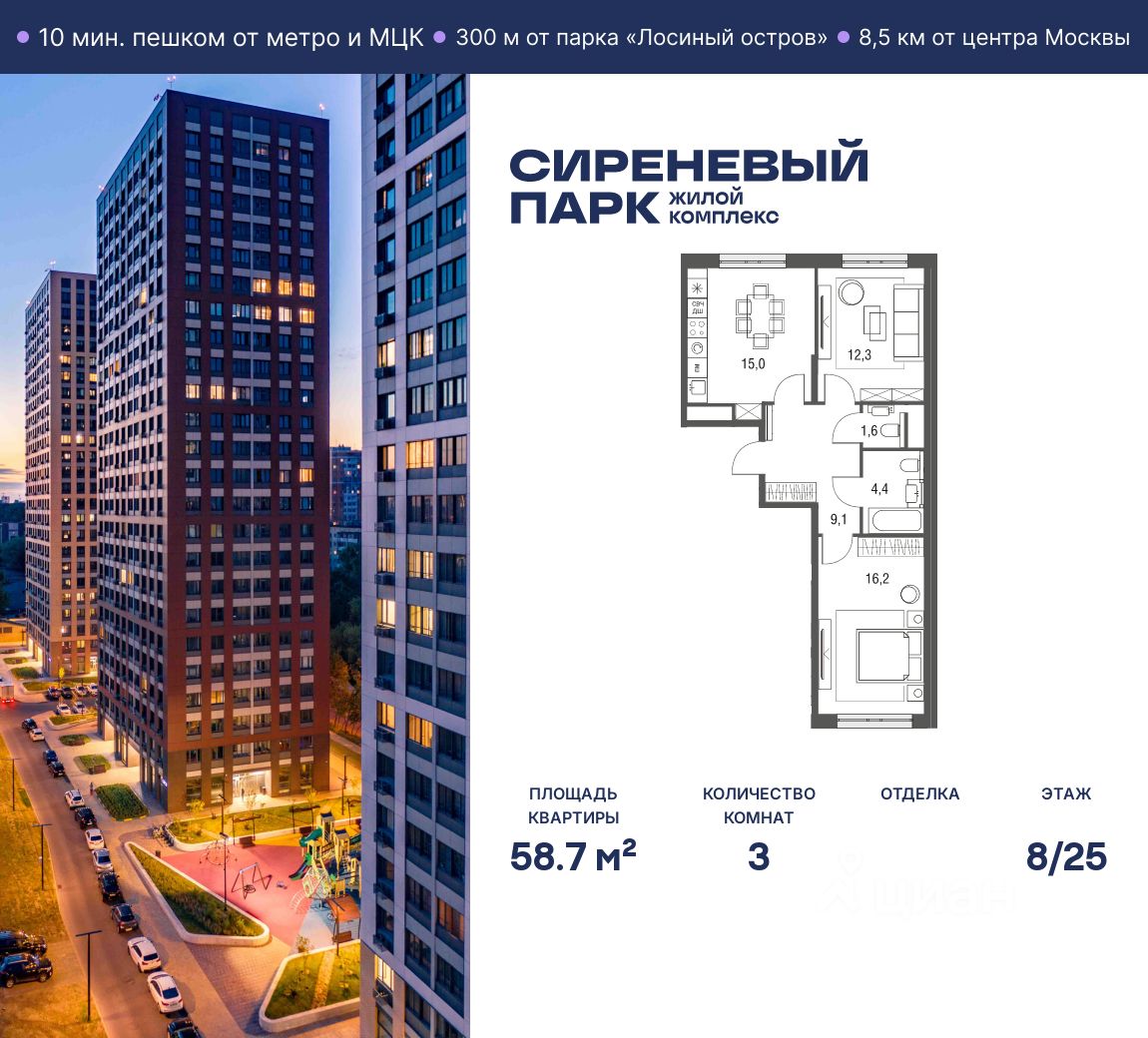 Продаётся просторная 3-комнатная квартира общей площадью 58.7 м² на 8 этаже в новом жилом комплексе "Сиреневый парк", расположенном в Восточном административном округе Москвы на улице Тагильская. Всего 10 минут ходьбы от станции метро "Бульвар Рокоссовского" и одноимённой платформы МЦК.