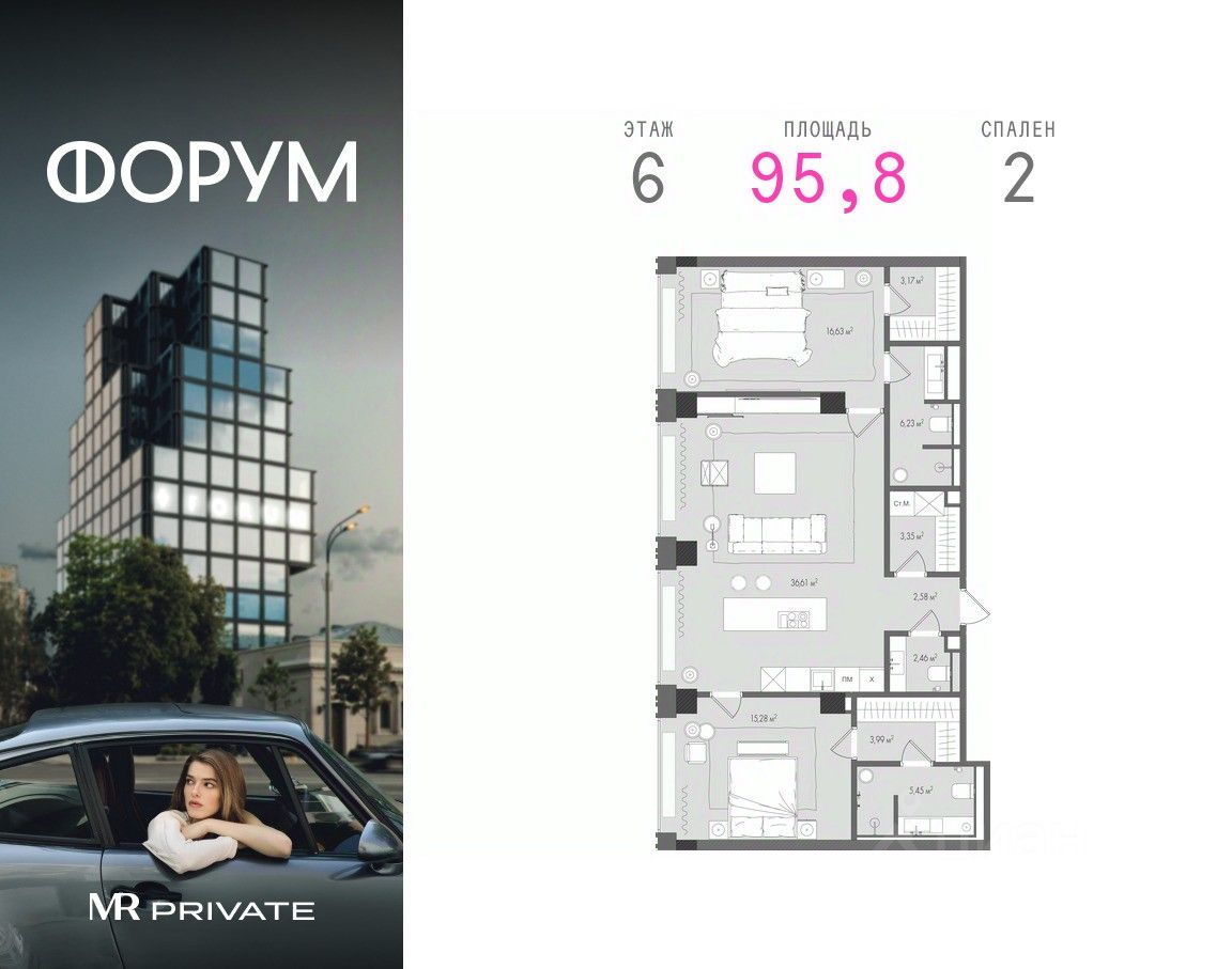 Продаётся 2-комнатная квартира общей площадью 95.75 м² в клубном доме Форум.
