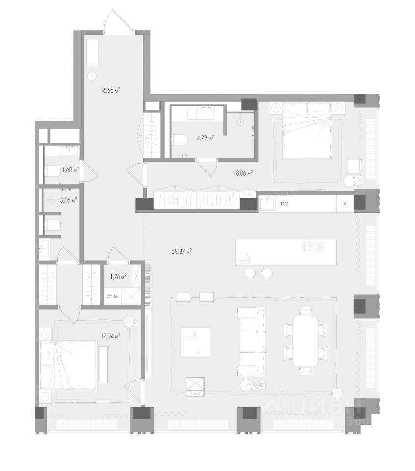 Общая площадь квартиры - 123.06 м².