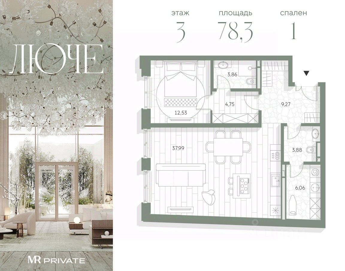 1-комнатная квартира общей площадью 78.34 м² в фамильном доме Люче, расположенная на 3 этаже 7-этажного дома.