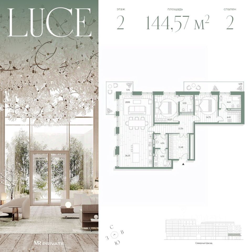 2-комнатная квартира общей площадью 144.57 м² в фамильном доме LUCE, расположенная на 2 этаже 7-этажного дома.