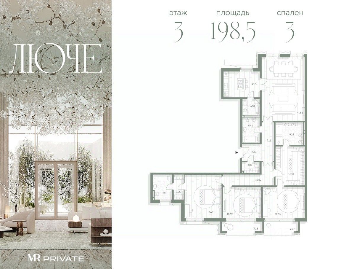 3-комнатная квартира общей площадью 198.51 м² в фамильном доме Люче, расположенная на 3 этаже 7-этажного дома.