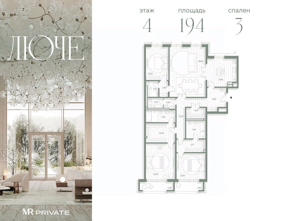 3-комнатная квартира общей площадью 193.96 м² в фамильном доме Люче, расположенная на 4 этаже 7-этажного дома.