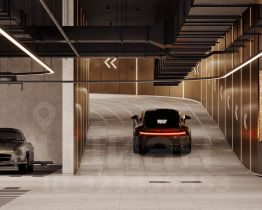 Одноуровневый паркинг имеет увеличенные габариты машиномест. Здесь предусмотрены места для зарядных станций повышенной мощности, благодаря которым электрокар можно зарядить всего за 20 минут.