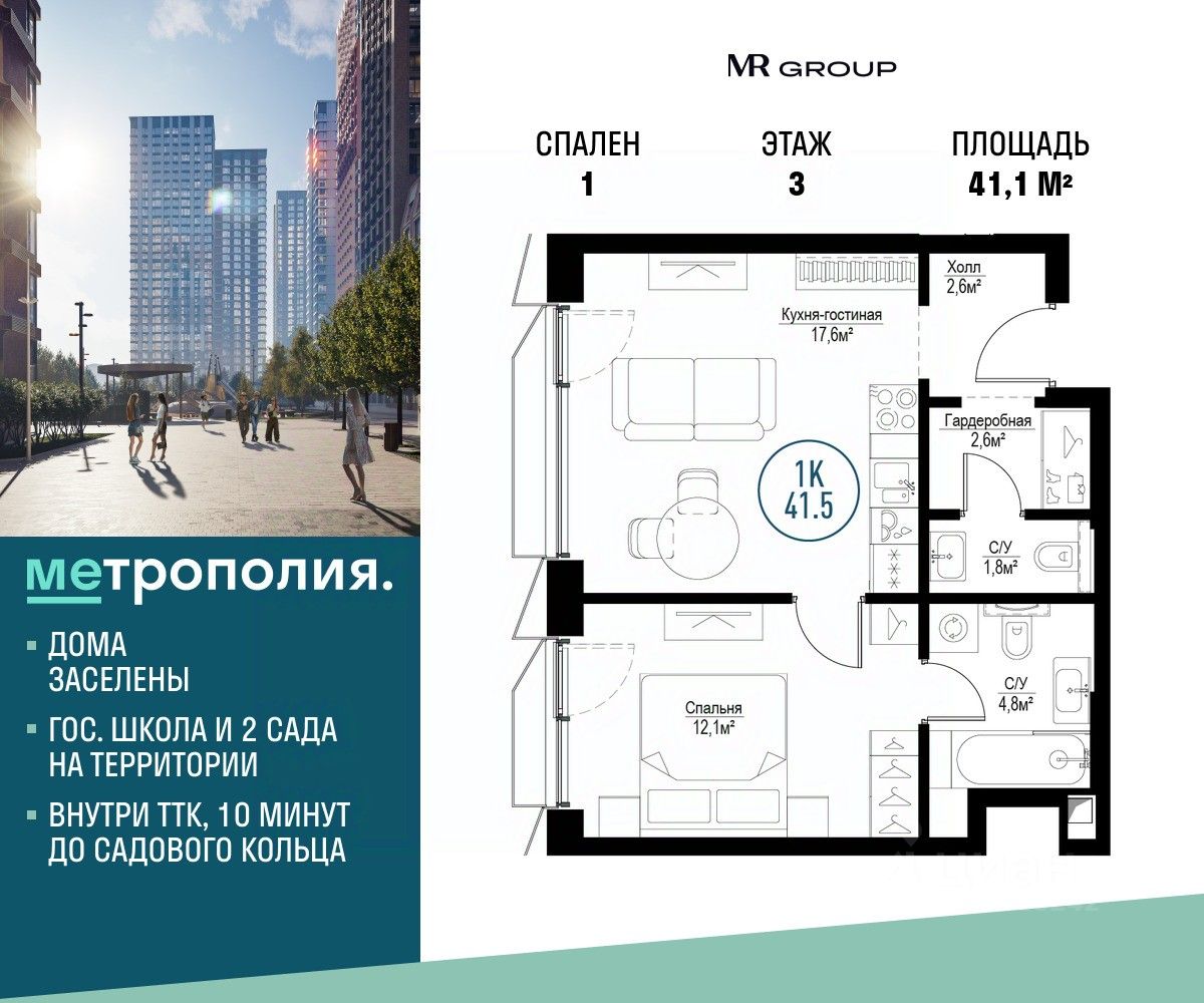 Продаётся 1-комнатная квартира общей площадью 41.10 м², на 3 этаже.