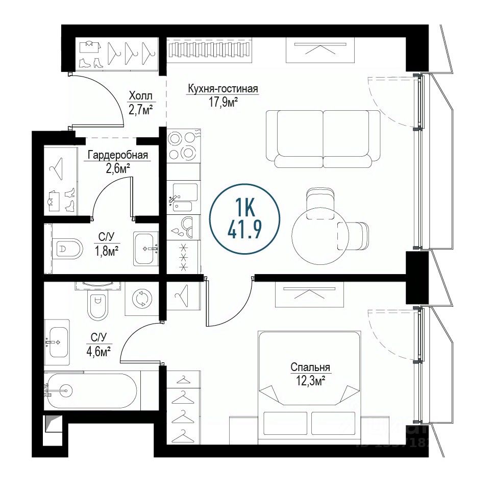 Продаётся 1-комнатная квартира общей площадью 41.50 м², на 26 этаже.