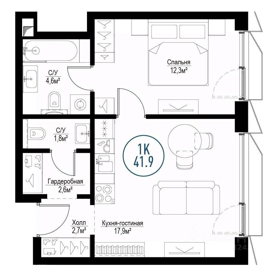 Продаётся 1-комнатная квартира общей площадью 41.50 м², на 19 этаже.