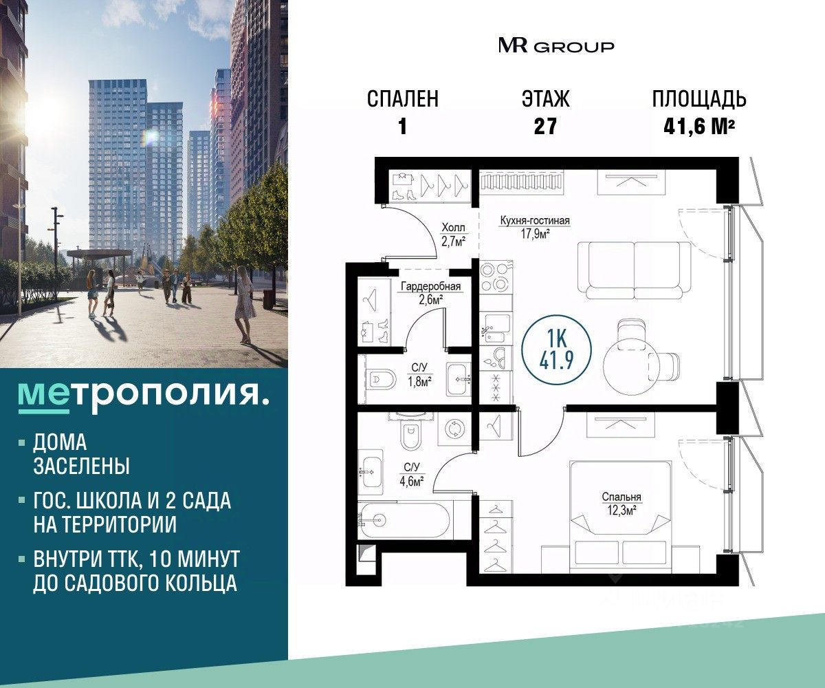 Продаётся 1-к квартира общей площадью 41.60 м², на 27 этаже.
