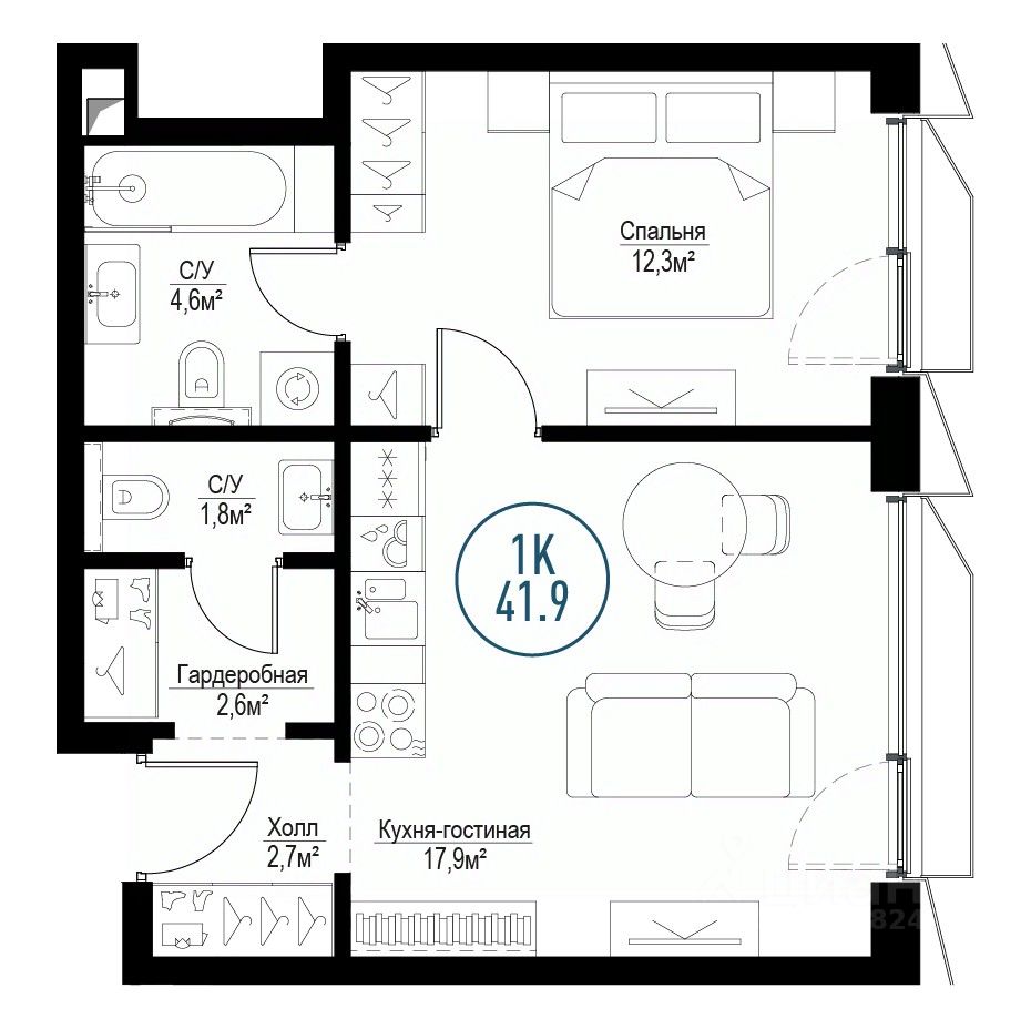 Продаётся 1-комнатная квартира общей площадью 41.50 м², на 24 этаже.