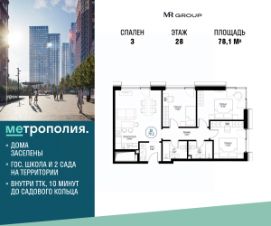 Продаётся 3-комнатная квартира общей площадью 78.10 м², на 28 этаже.