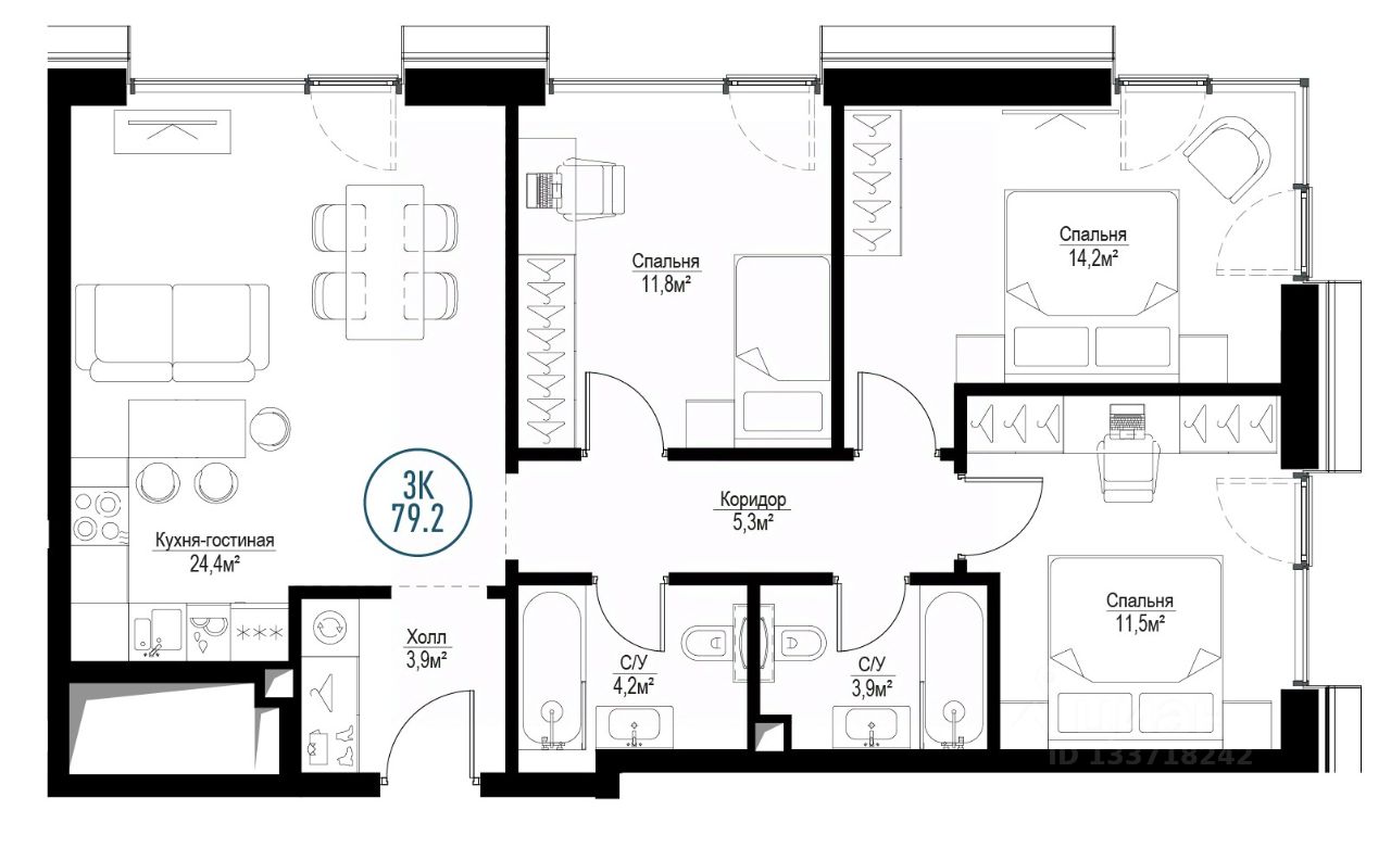 Продаётся 3-комнатная квартира общей площадью 78.40 м², на 25 этаже.