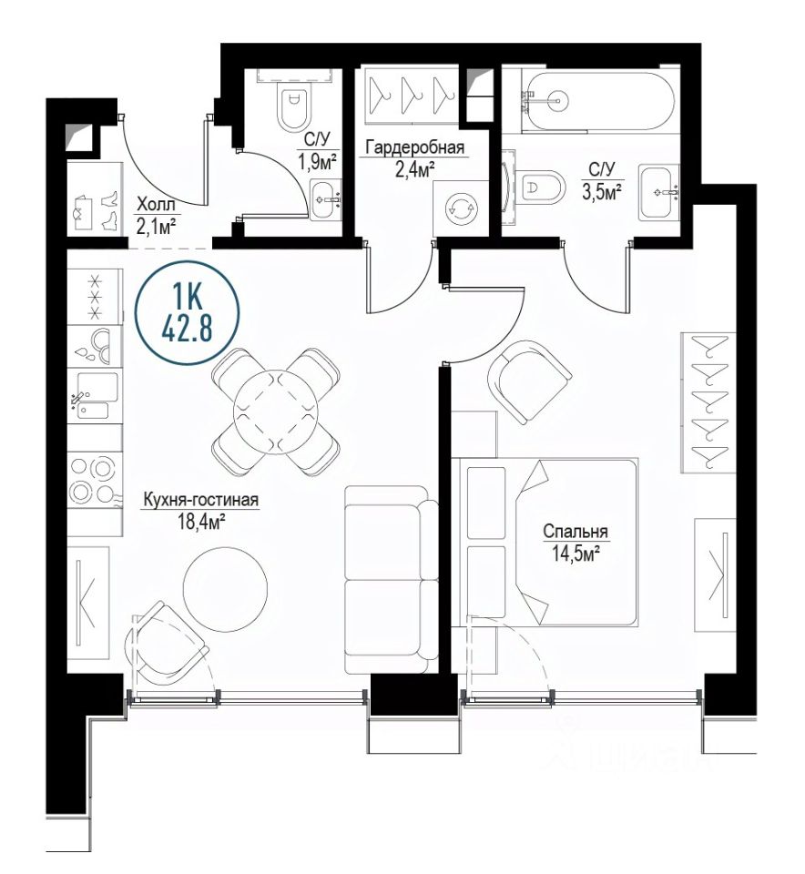 Продаётся 1-комнатная квартира общей площадью 42.50 м², на 3 этаже.