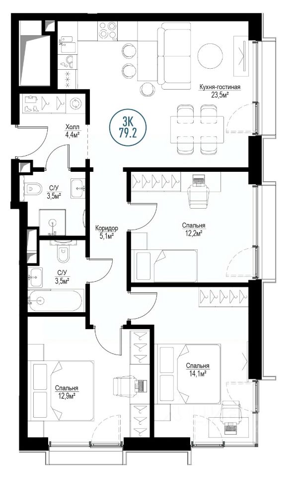 Продаётся 3-комнатная квартира общей площадью 78.40 м², на 27 этаже.